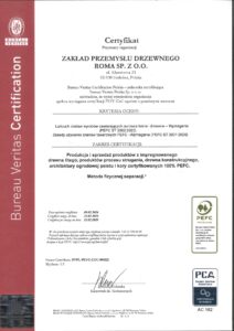 Posiadamy certyfikat PEFC® (BVPL-PEFC-COC-000122). Jest on dowodem na przestrzeganie zasad ekologii w procesach produkcji drzewnej.